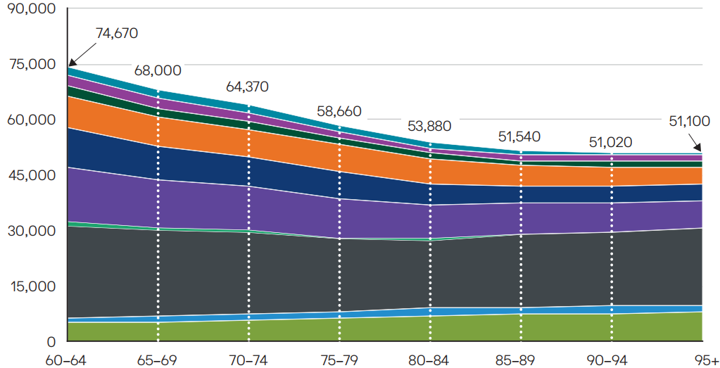 -Older households (65+) spend more on health care and charitable gifts, but SIGNIFICANTLY LESS on everything else. The following chart is what got my attention. See the downward trend in spending.